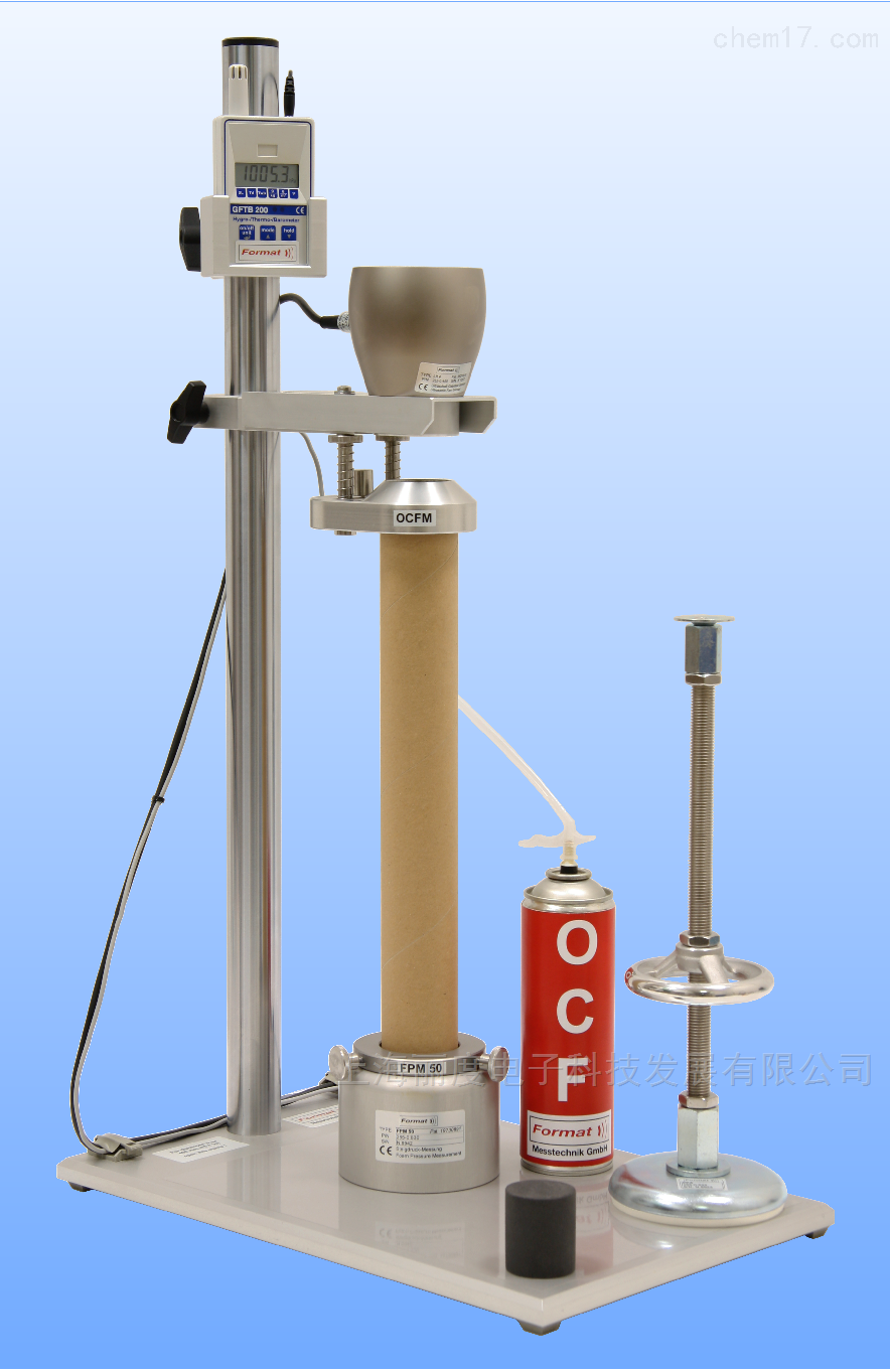 產(chǎn)品展示單組分泡沫測量裝置(OCFM) 是被設(shè)計(jì)用來測量OCF的上升曲線,上升壓力和反應(yīng)溫度的。包括了圓筒膨脹容器,和一套用于調(diào)整超聲波距離傳感器和容器的專用夾具。測試容器由底部的泡沫壓力測試裝置,紙板容器壁,和頂部可活動(dòng)的頂塞組成。在泡沫擴(kuò)張的過程中,膨脹產(chǎn)生的距離變化通過頂部的超聲波傳感器探頭獲取數(shù)據(jù),泡沫的溫度由熱電偶獲取反應(yīng)溫度參數(shù),同時(shí),OCFM可以選配GFTB200裝置,對(duì)環(huán)境參數(shù)進(jìn)行統(tǒng)計(jì)(環(huán)境溫度,氣壓,空氣濕度)。
