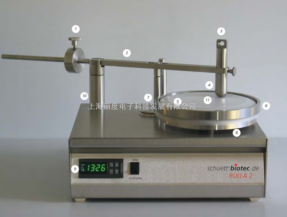 ⑴配重;⑵帶試驗指的平衡桿;⑶彈力平衡套;⑷不銹鋼試驗指;⑸培養(yǎng)皿;⑹不銹鋼環(huán);⑺偏心軸;⑻轉(zhuǎn)盤;⑼電子計時器;⑽球狀軸承;⑾蓋子;